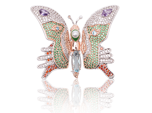 22k Gold plated brass and Rhodium. Emeral, Clear, Ruby, Amethyst, and Aquamarine crystals adorn the butterfly - along with faux pearl accents.